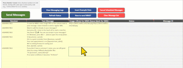 [β¨ Feature] Table-Based Message Sender The message sender is now organized as an Excel table. This means you can extend, move, or adjust your messages easily.