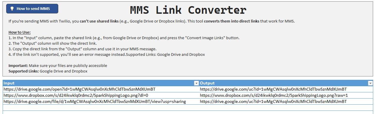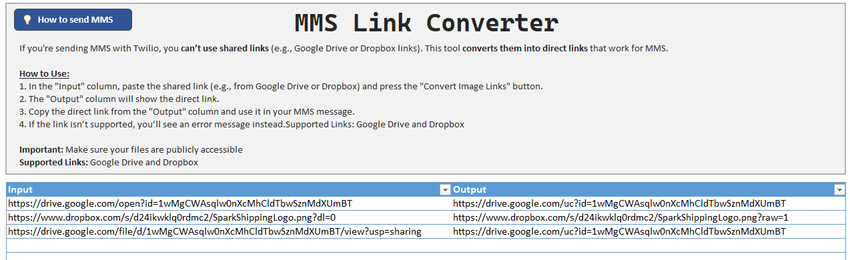 The new MMS Link Converter tool helps you prepare direct links for sending MMS messages. Shared links from platforms like Google Drive and Dropbox donβt work for MMS. This tool converts those shared links into direct links that are compatible with Twilio MMS.